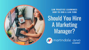 Hiring a marketing manager is often not an option. Small firms or medium size practices simply cannot afford to hire a marketing manager at that cost. Instead, you can save money by working with a third-party marketing manager at Martindale-Avvo. We can provide unique insights and visibility for your firm’s marketing for a fraction of the cost.