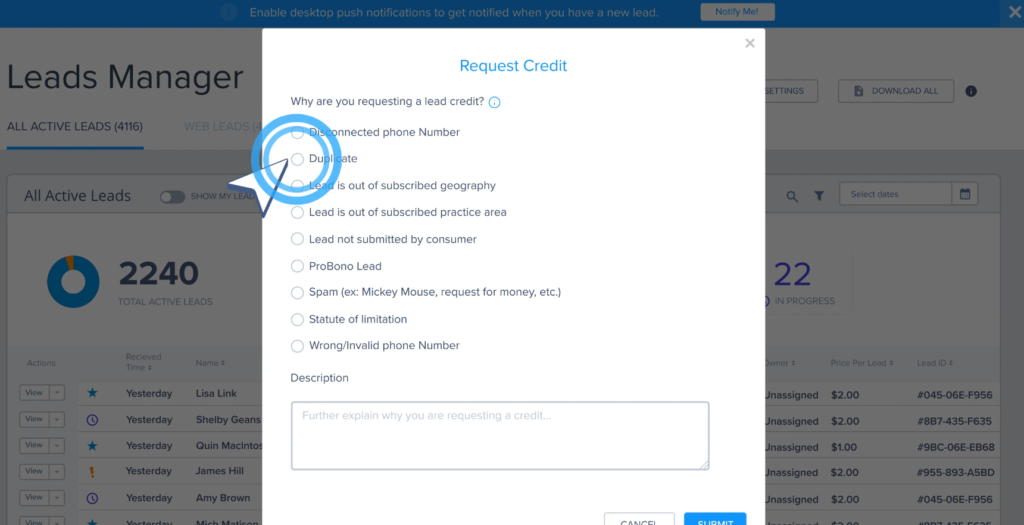 That’s why we offer case by case lead credit reimbursement. To start this process, click the view button next to the lead in question and select request credit from the dropdown. Select your reason for your request in the popup window, include any relevant comments and hit submit.